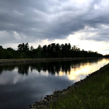 Five-thirty’s afternoon light fades from the Menominee where this water bug zig-zags northward over the glassy sturgeon-black surface of the river; a needle pulling threads of silver-speckled sunlight together, close as lovers, stitching a narrow pocket into which I slip secretly the ruins of another unmatched summer’s day.